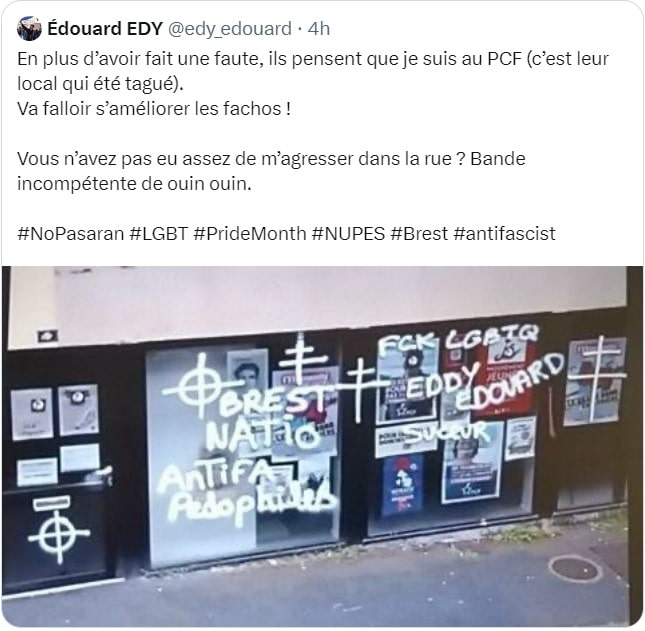 E Brest d’an 12 a viz gouere eo bet « adlivet » lochoù ar PCF hag ar CGT. « Brest Natio », « antifa pédophiles », « Fuck Antifa » a zo bet skrivet war prinistri al lochoù. Tagoù all a oa a-enep Edouard Edy (ha n’eo ket « Eddy »), ur emsavour kleizour LFI hag LGBT, studier e skol-veur Brest. Kroazioù keltiek ha kroazioù Loren a zo bet taget ivez.