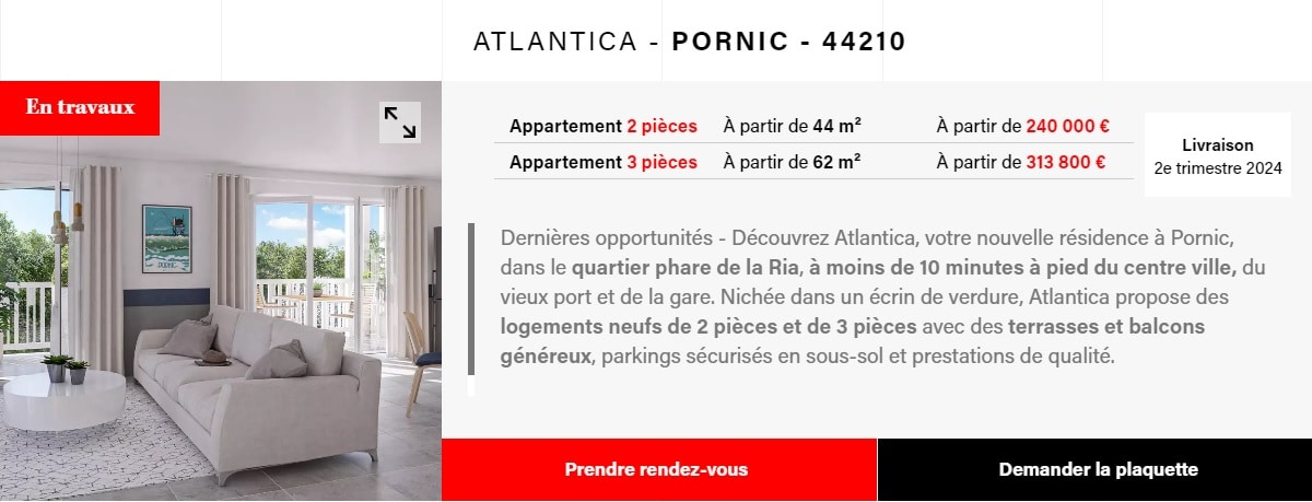 Ha raktresoù all a-seurt se a zo e Pornizh : Villa Maria, e karter ar Ria : 185 000€ evit ur studio ! 444 000€ evit ur ranndi brasoc’h ! Atlantica : 240 000€ evit 44m², …
