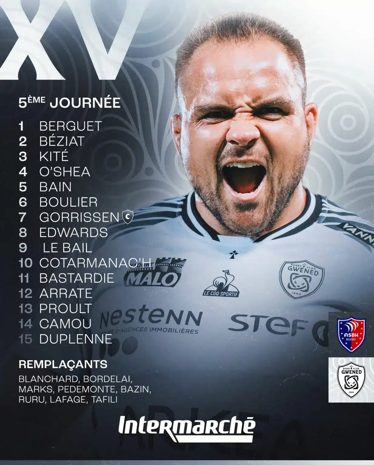 Le XV de départ : 1. Charles-Henri Berguet, 2. Théo Béziat, 3. Phillip Kité, 4. Darren O’Shea, 5. Hamish Bain, 6. Léon Boulier, 7. Francisco Gorrissen (capitaine), 8. Joseph Edwards, 9. Jules Le Bail, 10. Jean Cotarmanac’h, 11. Théo Bastardie, 12. Alex Arrate, 13. Arthur Proult, 14. Romaric Camou, 15. Gwenaël Duplenne.