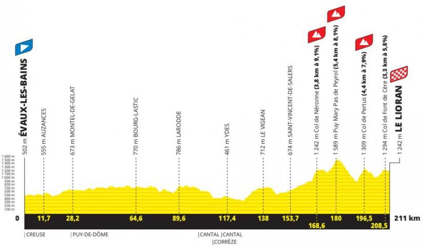 Direction le massif central, accidenté. avec un final contenant quatre ascensions : le col de Néronne (3,8 km à 9,1 %) le Puy Mary Pas de Peyrol (5,4 km à 8,1 %), le col de Pertus (4,4 km à 7,9 %) et le col du Font de Cère (3,3 km à 5,8 %), dont le sommet est situé à moins de trois kilomètres de l’arrivée au Lioran.