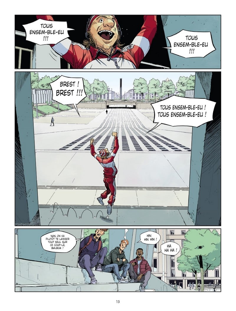 Dans cette nouvelle bande dessinée, Kris entend décrire le milieu des supporters du club de football de Brest. C’est un passionné. Dès l’âge de six ans, son père l’emmenait assister à des matches du stade brestois. A dix ans, il avait intégré les équipes de jeunes, jusqu’à ses quinze ans. Il explique que cette histoire, née dans les années 1990 quand le club faillit disparaître à la suite d’un dépôt de bilan, s’est développée au début des années 2000 lors de sa reconstruction. Avec humour, il révèle le comportement obsessionnel d’un supporter brestois, passant ses journées à hurler « Tous ensem-ble-eu ! Tous ensem-ble-eu ! ».