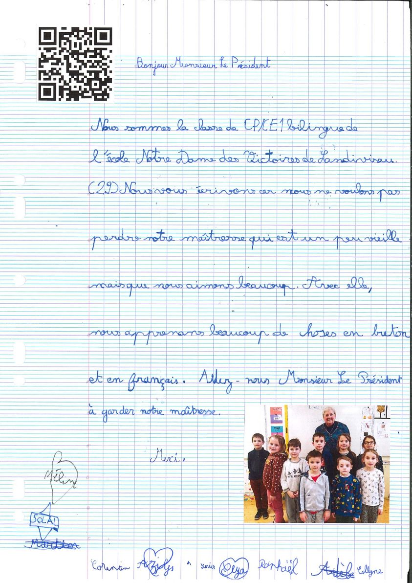 E Landivizio, Penn ar Bed, e skol Notre-Dame des Victoires o doa gwelet bugale ar CP-CE1 divyezhek seizh mestr-skol abaoe miz here 2022. An hini diwezhañ a zo ehanet abaoe miz genver. Kavet e oa bet gant ar skol ur vamm-gozh a-zoare evit ober skol : Andrée Moigne. Ur vrezhonegerez a-vihanik eus Bro-Leon (Plouzeniel) eo hag he deus an holl ziplomoù rekis : ar master hag ar genstrivadeg. An holl vugale hag o zud a venn dezho he mirout ! Ur vaouez ampart war he micher eo hag ganti e vez klevet ur brezhoneg c’hwek gant ar vugale, un dudi he c’hlevet !