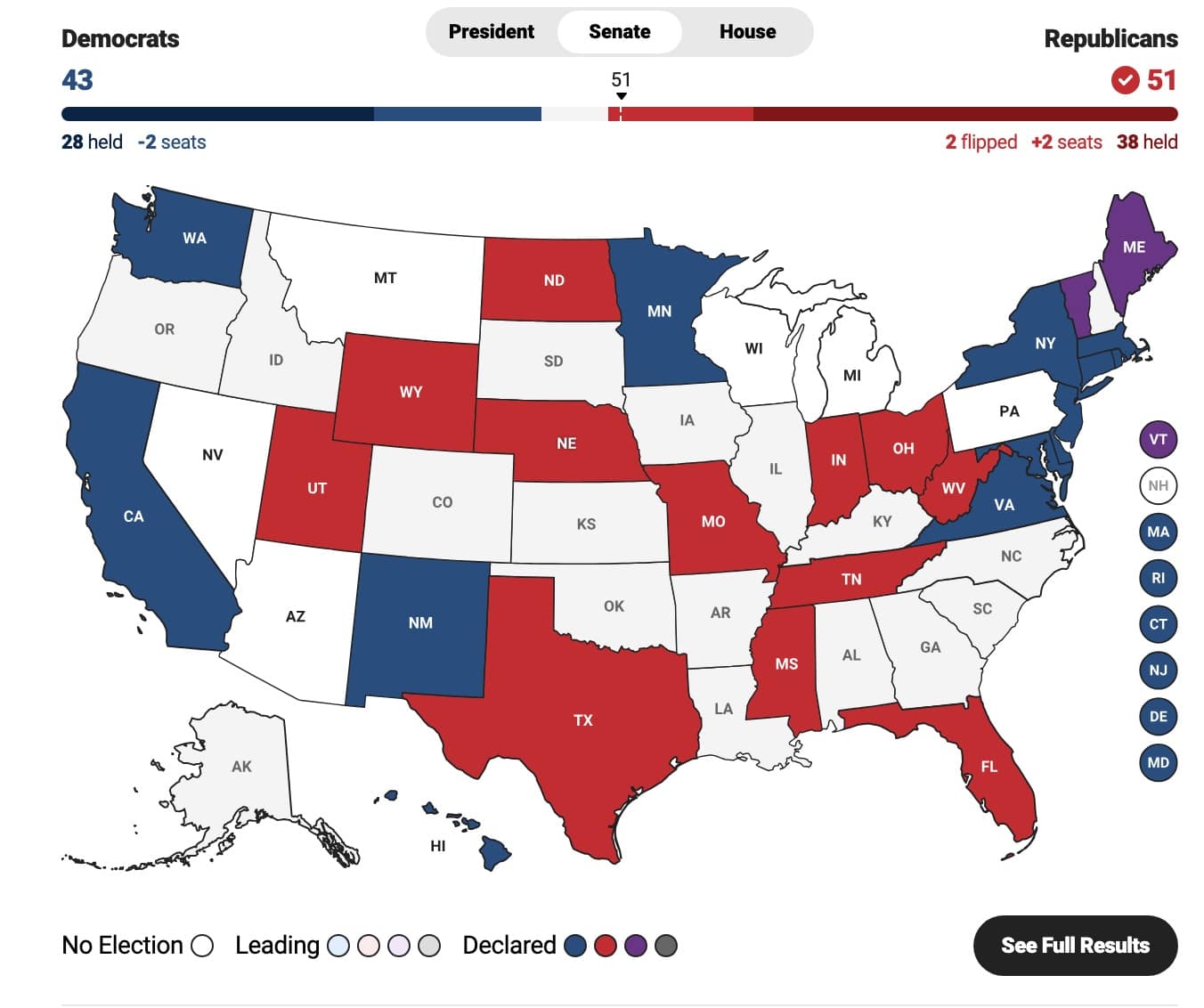 - Texas : Le sénateur Ted Cruz (R) a remporté un troisième mandat face au démocrate Colin Allred. Malgré les changements démographiques et les débats sur les lois sur l’avortement, Cruz a maintenu une avance confortable dans les sondages.
