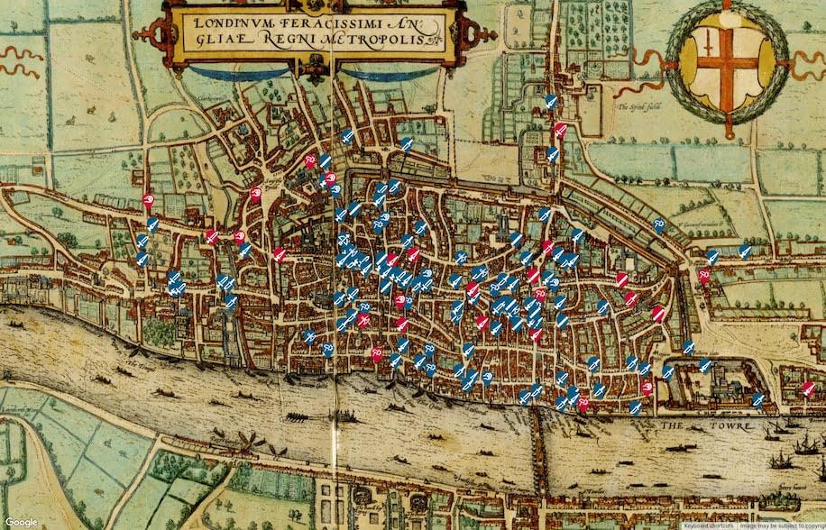 Une carte de Londres indiquant les lieux des homicides recensés au XIVe siècle.