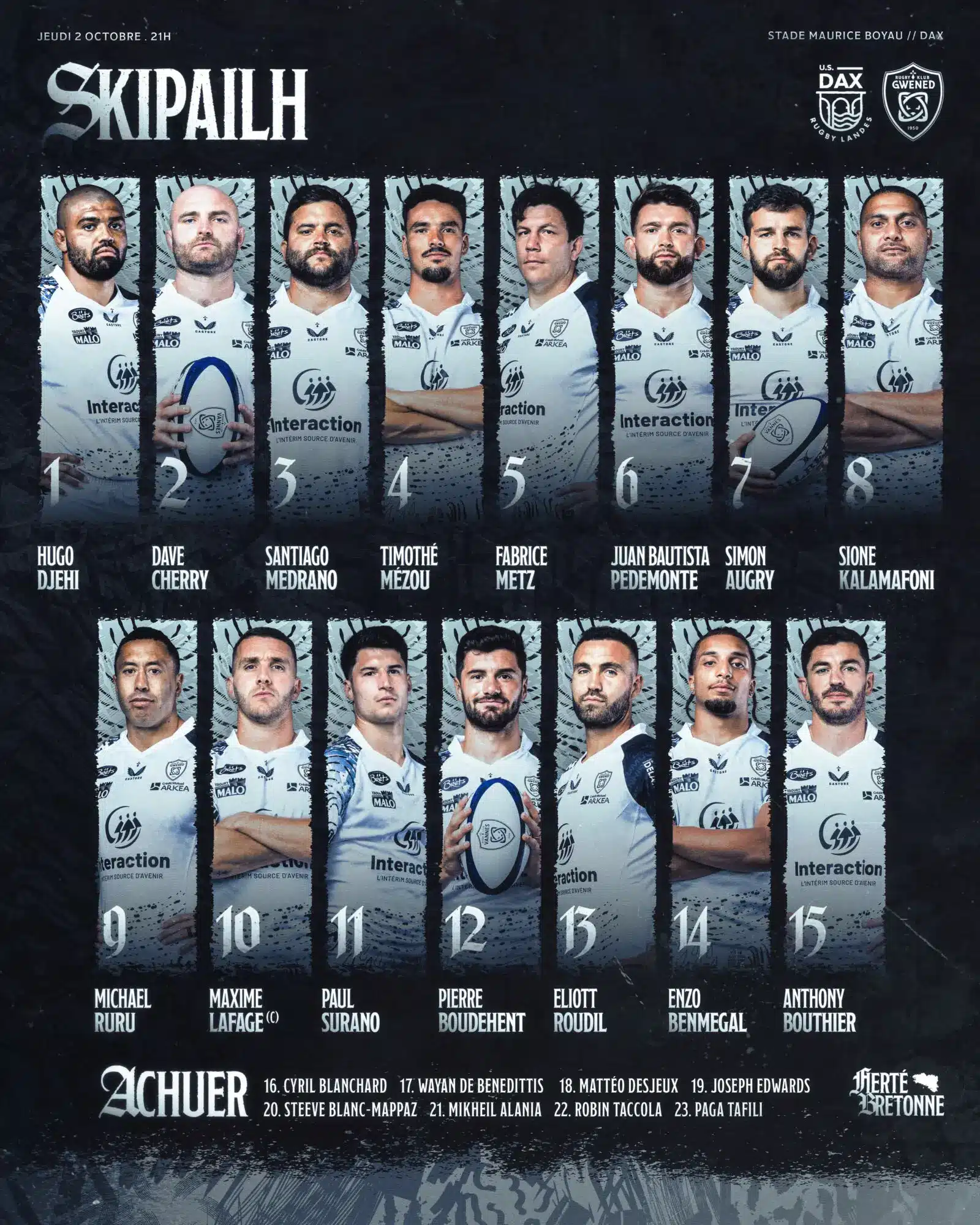 Le nouveau manager Vincent Etcheto a largement fait tourner après la lourde défaite à Provence (42-15) : onze changements dans le XV. Hugo Cerisier tient l’ouverture en l’absence de Romuald Séguy (touché à un doigt), Jean-Baptiste Barrère emmène la troisième ligne, Lemalu – Matthews reforment la paire de 2e ligne, et les couloirs sont confiés à Ben Alla et Couget. Le plan dacquois ? Miser sur l’intensité à domicile, la générosité sans ballon et des séquences longues pour étirer la défense bretonne. Les Landais savent aussi que leurs fins de matchs ont coûté cher depuis août : l’entrée des « finisseurs » sera un levier assumé pour tenir l’heure de jeu et au-delà.