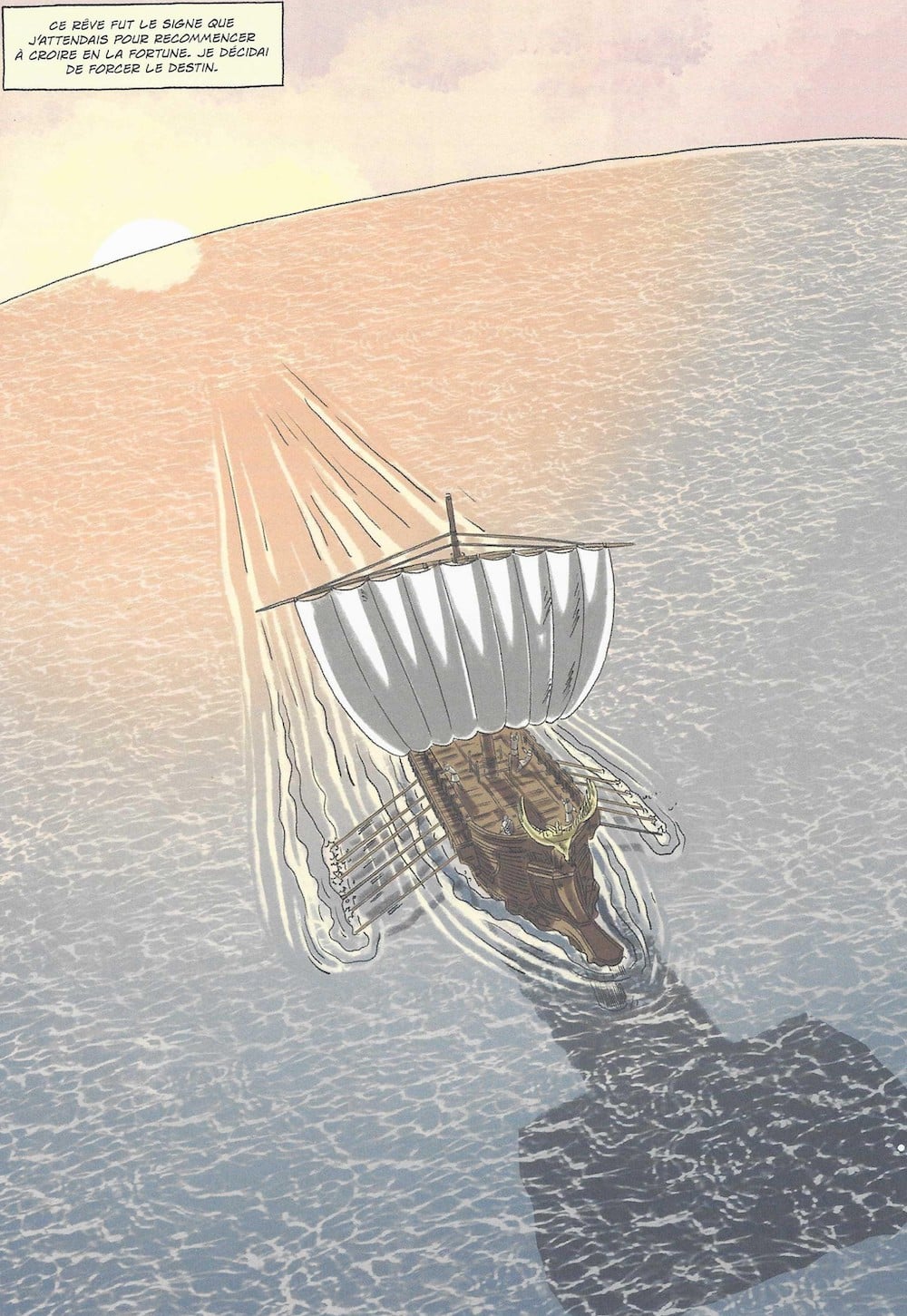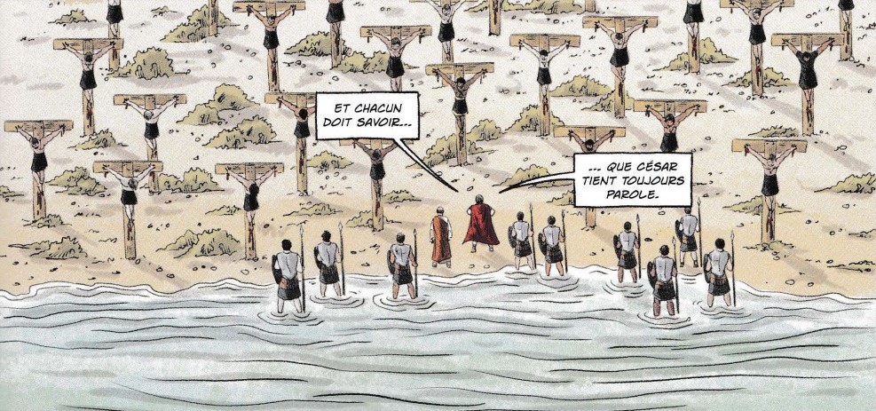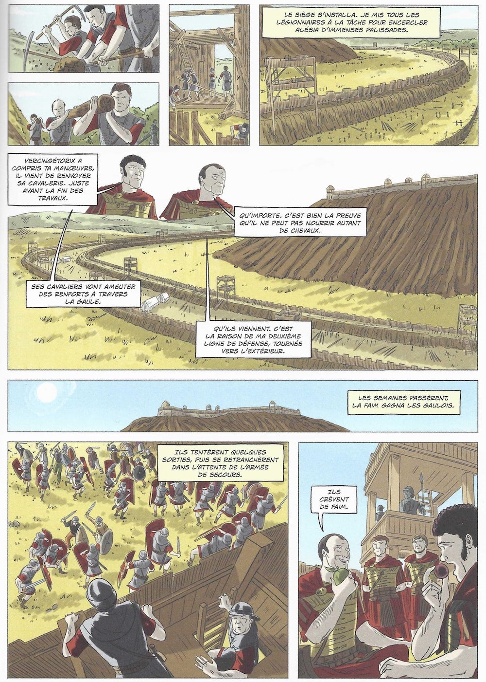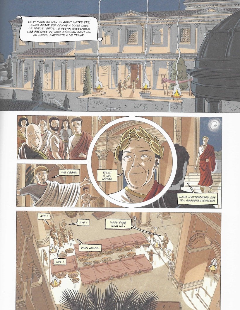 Le scénariste fait le choix de reprendre le procédé utilisé dans La Guerre des Gaules : c’est César qui raconte sa vie, en puisant fréquemment dans ses citations authentiques. L’une d’elles est révélatrice de sa stratégie de prise de pouvoir : « Avec de l’or, on a des soldats. Avec des soldats, on a de l’or ». César partage ainsi avec nous ses pensées. On découvre sa pauvreté de naissance, son humiliation face aux familles riches, sa fragilité physique… Il révèle que c’est grâce aux manœuvres de sa mère qu’il est nommé prêtre de Jupiter. Il explique comment, devenu un militaire, il va parfaire son éloquence grâce à un célèbre rhéteur grec, Molon de Rhodes. On découvre son premier massacre : pris en otage par des pirates, il est libéré puis revient pour tous les crucifier. Puis, partant de conquête en conquête, en Hispanie, en Gaule, contre les Helvètes et les Germains, il est parfois pris d’une fureur guerrière…