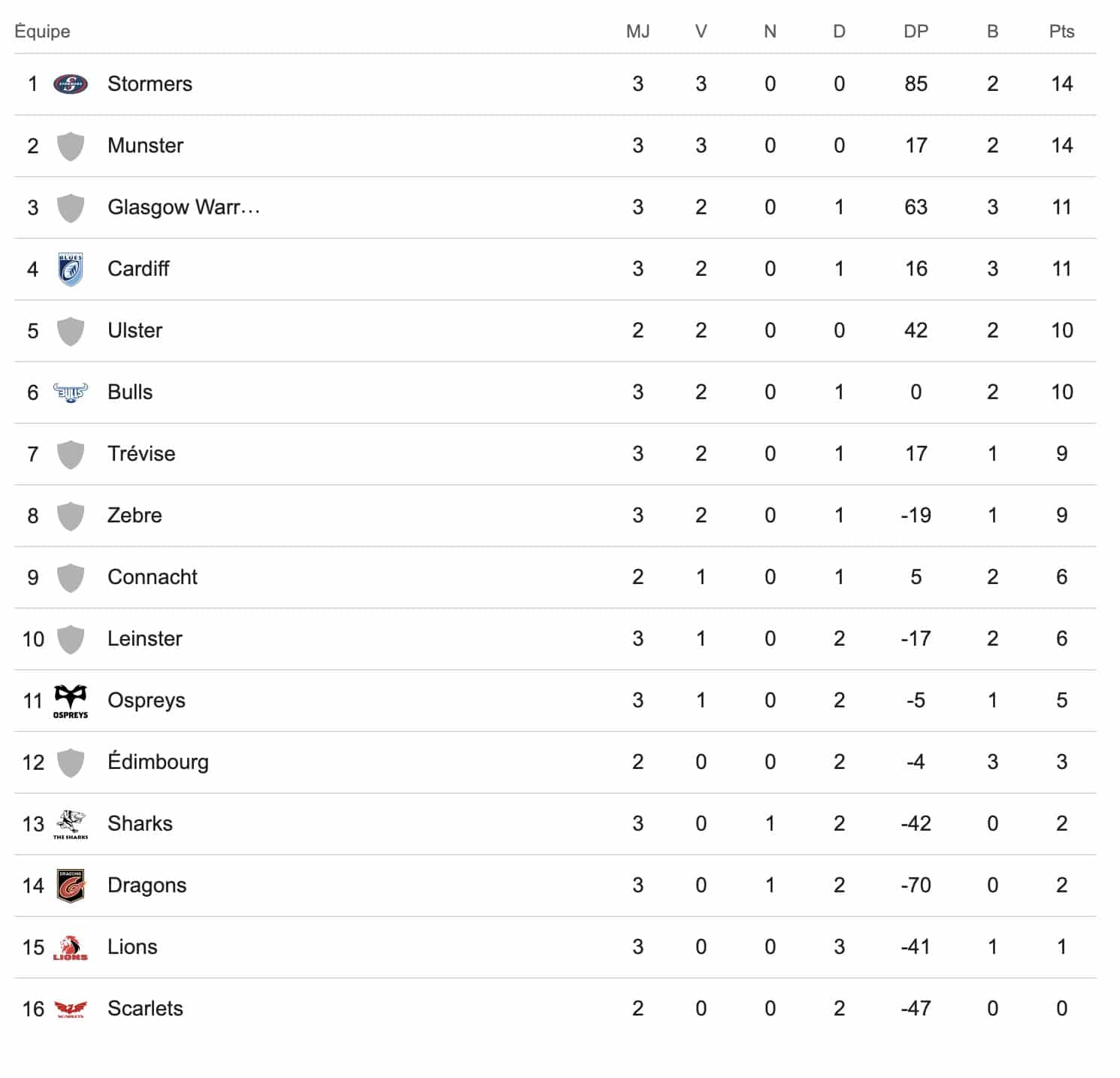 Grâce à ce large succès, le Stormers prend la tête du classement à la différence de points avec trois victoires bonifiées.