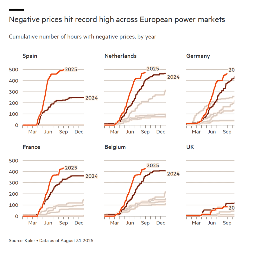 Le résultat : des prix de marché qui plongent dans le négatif quand le vent souffle fort, puis explosent dès qu’il faiblit. En 2025, la France a déjà connu plus de 300 heures de prix négatifs, selon les chiffres repris par le FT. Cela signifie que les producteurs doivent parfois payer pour se faire acheter leur électricité ! Une aberration économique que seul le stockage peut corriger.