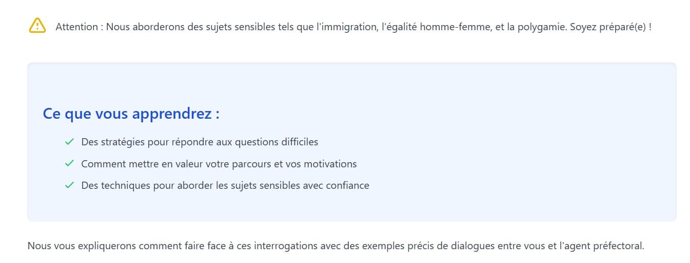Soucieux de diversifier ses services, certains sites proposent également des coachings pour les entretiens de naturalisation ou les meilleures stratégies pour répondre aux « questions sensibles » des préfectures. Prévoyant, ces sites avertissent cependant leurs clients qui pourraient être choqués par certaines valeurs françaises par trop libérales :