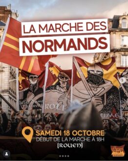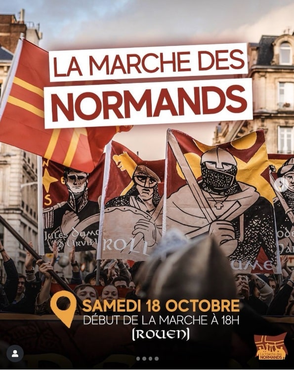 La banderole de tête donnait le ton ce samedi 18 octobre à Rouen : « Fiers d’être Normands ». Organisée pour la troisième année de suite par les militants identitaires du groupe « Les Normaux », cette Marche des Normands était, sans surprise, jugée comme « d’ultra-droite » par tout le milieu de la gauche locale qui avait organisé une contre-manifestation pour l’occasion. Pourtant centrée sur la célébration de « l’identité millénaire de la Normandie », cette marche aura suffisamment bouleversé le camp du bien rouennais pour qu’un collectif de « guide-conférencières, historien.ne.s, spécialistes passionnés de l’histoire et de la culture normande » s’offusque dans un style bien connu de la manifestation et affirme « n’avoir rien à voir avec “La marche des normands ». Nous refusons catégoriquement que l’image de notre région soit associée à une identité réactionnaire, de rejet et d’exclusion ».