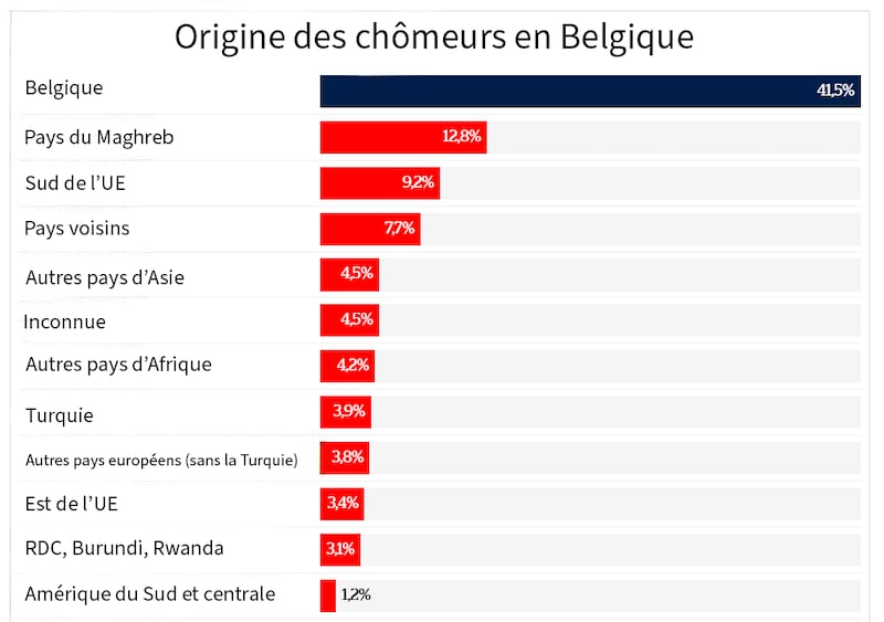 Les derniers chiffres communiqués en Belgique par le ministre de l’Emploi David Clarinval (MR) confirment un déséquilibre croissant du marché du travail belge. D’après les données publiées le 29 octobre par 7sur7.be, près de six chômeurs sur dix sont d’origine étrangère, tandis que seuls 41,5 % ont des parents belges. Les origines les plus représentées sont celles du Maghreb (13 %), du sud de l’Union européenne et des pays voisins.