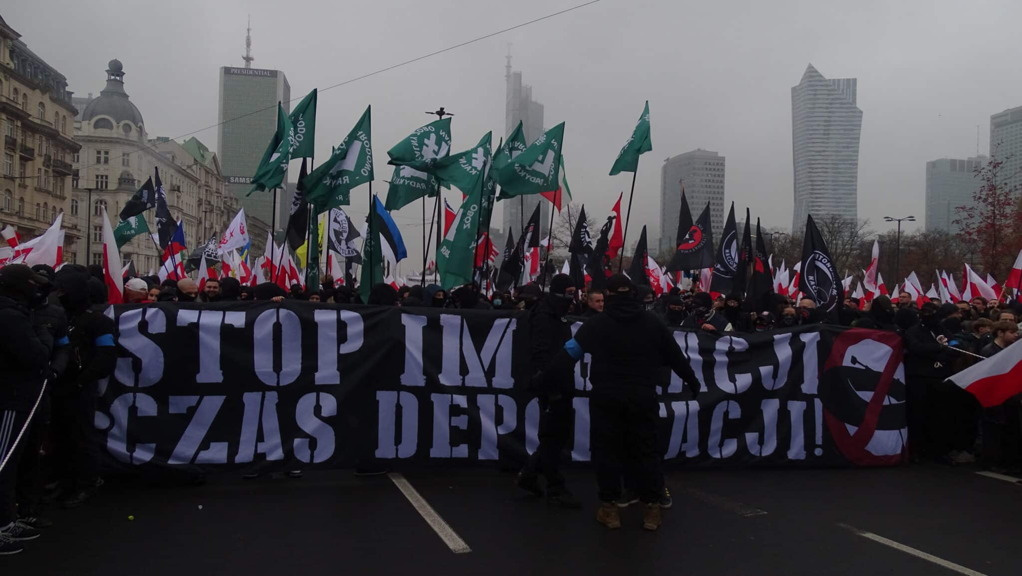 Certains militants de la Młodzież Wszechpolska (Jeunesse de toute la Pologne) ont symboliquement brûlé un drapeau de l’Union européenne, geste interprété comme un refus du centralisme bruxellois et de la dilution des souverainetés nationales.