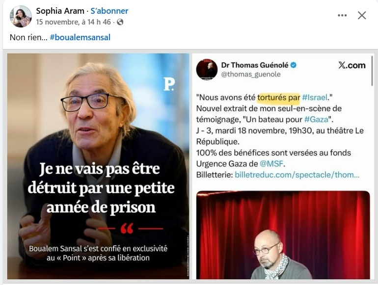 D’ailleurs la chronique Sophia Aram n’aura pas résisté à la malice de mettre en parallèle l’attitude de Boualem Sansal, récemment libéré d’une vraie prison et celle du « torturé » Thomas Guénolé dans un montage savoureux