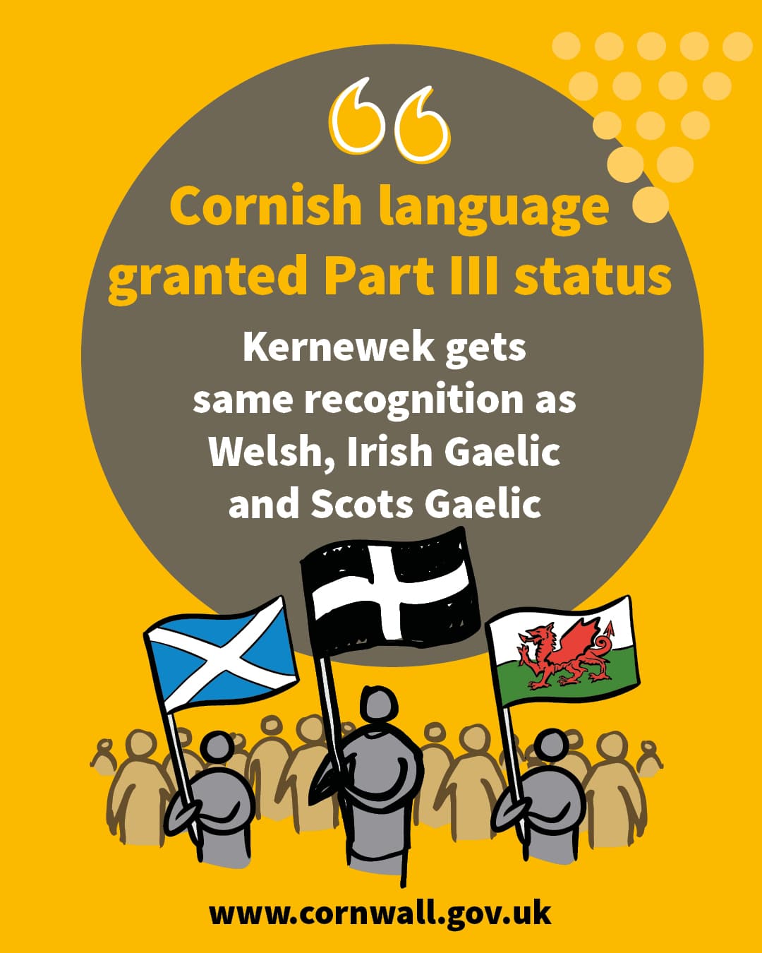 Le président du conseil, Leigh Frost, a déclaré : « C’est une excellente nouvelle pour les Cornouailles. L’obtention du statut de langue de la partie III témoigne des années d’efforts du conseil des Cornouailles, de nos partenaires et des nombreux groupes communautaires qui se sont battus pour préserver la langue cornique. Voir le cornique reconnu aux côtés du gallois, du gaélique écossais et du gaélique irlandais est une grande fierté pour nous tous. »