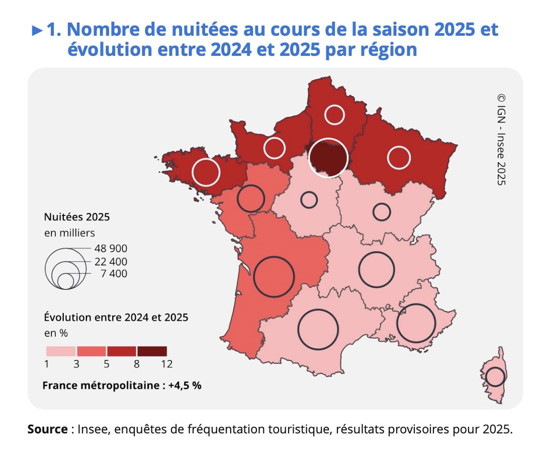 L’un des faits marquants de la saison réside dans l’afflux inédit de touristes étrangers, en augmentation de 11,6 % par rapport à 2024, soit une progression supérieure à la moyenne nationale. Ces derniers totalisent 4,8 millions de nuitées, un record pour la région