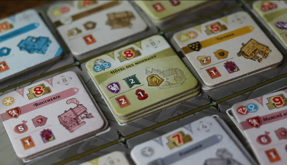Construire : après le terrain et le permis, on peut construire des bâtiments pour les guildes ou des bâtiments publics. Il faut payer le coût de la construction (toujours le bois). En construisant un bâtiment public (hôpital, école…), on a la possibilité de présenter au conseil municipal un patriarche qui orientera la politique de la ville (ce qui permettra d’obtenir les points de victoire).