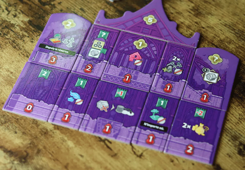 Edifier la cathédrale : pour construire un morceau de la cathédrale, il faut dépenser un jeton Pélican (l’emblème de la cathédrale) gagné au préalable, soit avec la guilde, soit en construisant des bâtiments publics. La cathédrale fait gagner de la réputation et permet de doubler ses revenus. Si obtenir des jetons Pélican prend beaucoup de temps, c’est cohérent avec l’Histoire lorsqu’on connait les délais pour bâtir une cathédrale au Moyen-Âge.