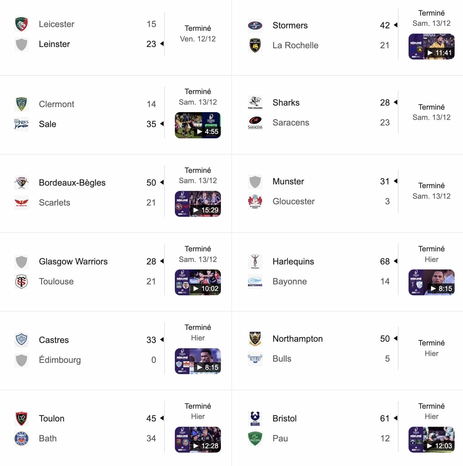 Nous vous proposons de découvrir ci-dessous (en fin d’article) les résumés vidéos de la deuxième journée de Champions cup. Il ne s’est franchement pas passé grand chose (hormis un Glasgow Toulouse à deux visages ou un Leicester-Leinster que Bein Sports, qui possède tous les droits TV, n’a pas daigné retransmettre) et pour cause : de plus en plus d’équipes ne jouent pas à fond, font tourner, se déplacent « à poil », ce qui fausse totalement une compétition, sans compter l’abjection des équipes sud africaines, et le format, pas dingue.