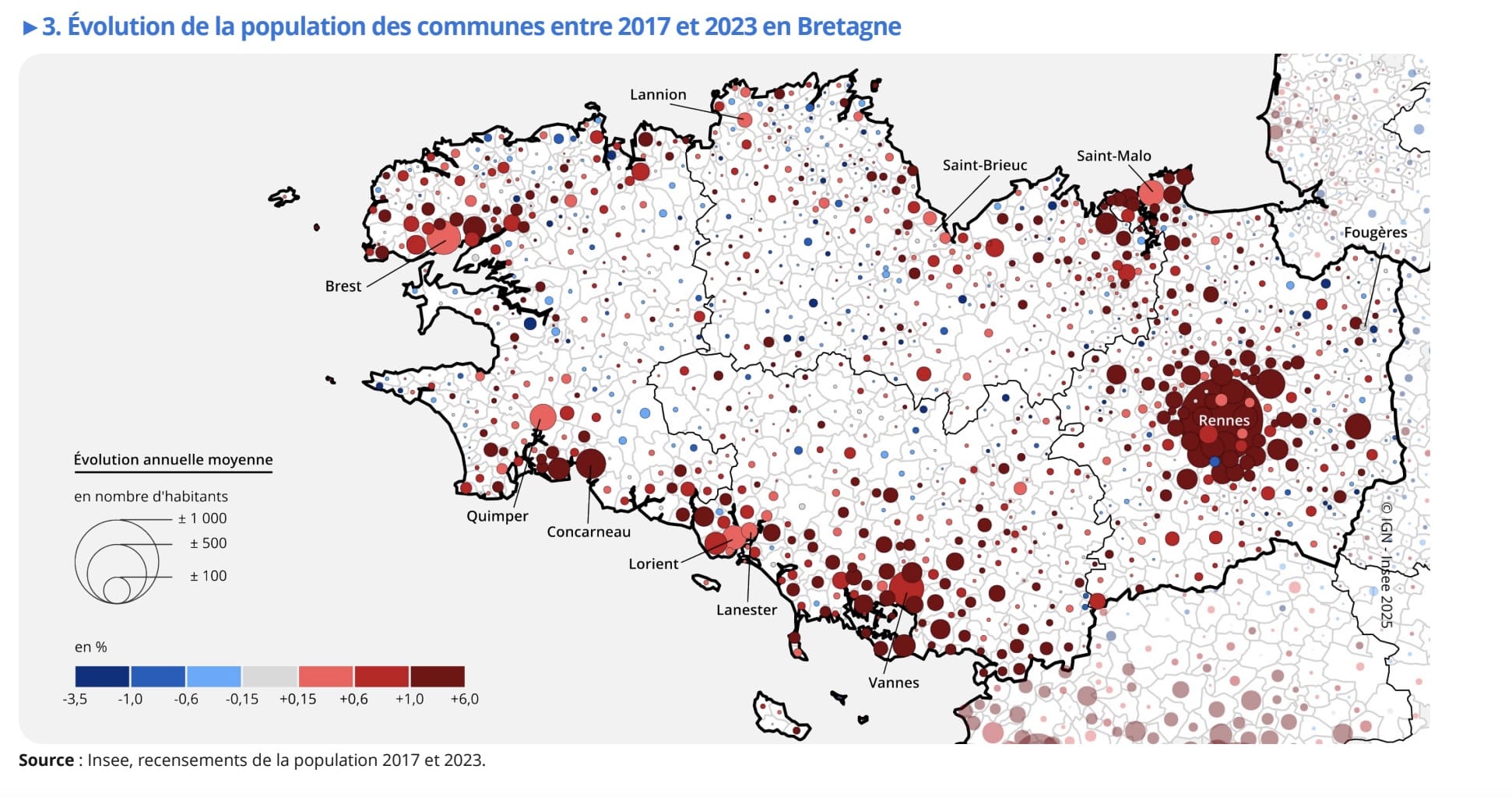 La hausse démographique est continue depuis plus d’une décennie, avec une légère accélération récente : +0,5 % par an entre 2012 et 2017, puis +0,6 % entre 2017 et 2023. L’Insee souligne toutefois que cette croissance repose de plus en plus sur les migrations résidentielles, le solde naturel devenant progressivement déficitaire. En clair : les Bretons font moins d’enfants, et sont petit à petit remplacés par d’autres populations arrivantes.
