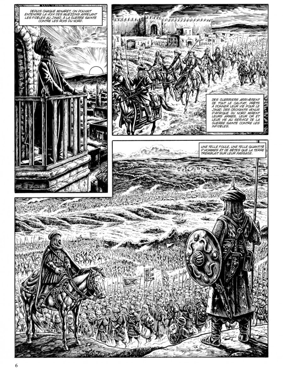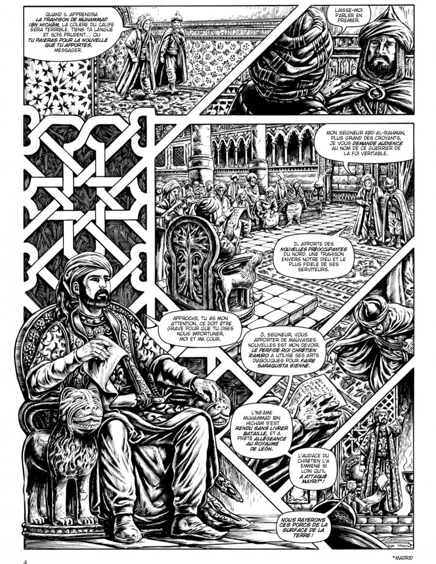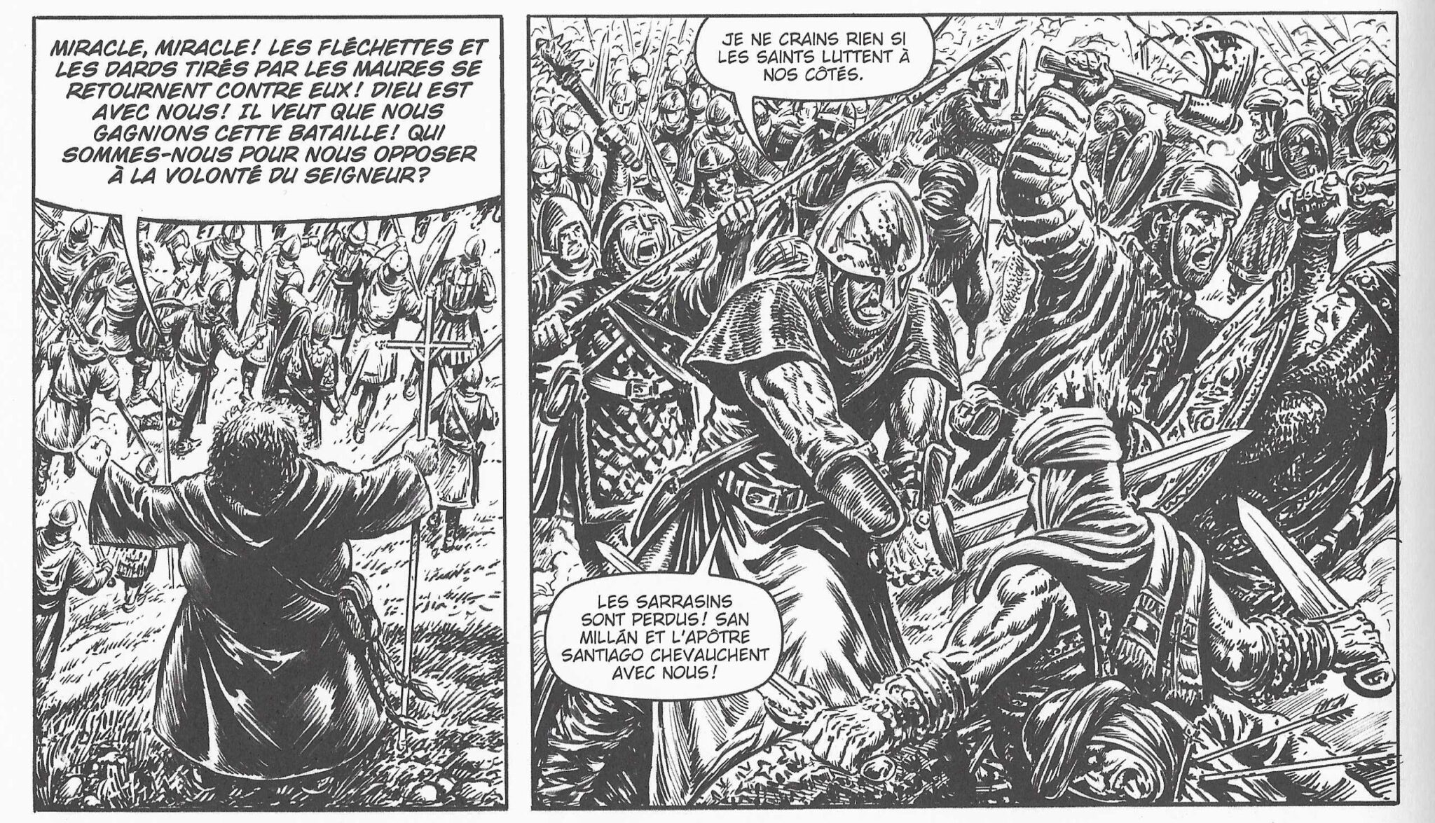 Dans cette nouvelle bande dessinée, Rafael Jimenez décrit La bataille de Simancas. Il faut savoir qu’en 939, le roi Ramiro II de León marcha sur Saragosse. Le gouverneur sarrasin de Saragosse se soumit alors au roi catholique et plaça toutes ses terres sous sa souveraineté. Pour anéantir définitivement le royaume de León, le calife omeyyade Abd al-Rahman III rassembla une immense armée, galvanisée par l’appel au djihad. Après avoir pillé les villes rencontrées en chemin, les contingents du califat livrèrent la bataille au nord-est de Simancas pendant plusieurs jours. Selon les chroniques arabes et chrétiennes, une éclipse solaire eut lieu quelques jours avant la bataille. Les chroniques chrétiennes ajoutent que saint Jacques apparut sur un cheval blanc, tout comme saint Millán. Les chrétiens mirent en déroute les troupes musulmanes. L’importance de cette première grande victoire réside moins dans les gains territoriaux des royaumes chrétiens que dans sa valeur symbolique.