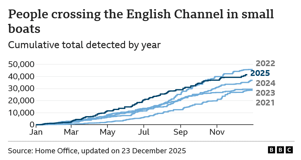 Selon les données du ministère britannique de l’Intérieur relayées par la BBC, 41 455 migrants sont arrivés au Royaume-Uni en 2025 à bord de petits bateaux après avoir traversé la Manche. Ce total dépasse celui de 2024, qui s’élevait à 36 816 personnes, et constitue un record pour un mois de décembre ces dernières années. Le samedi 21 décembre, 803 migrants répartis sur 13 embarcations ont été recensés en une seule journée. La barre des 40 000 clandestins avait été franchie quelques jours auparavant.