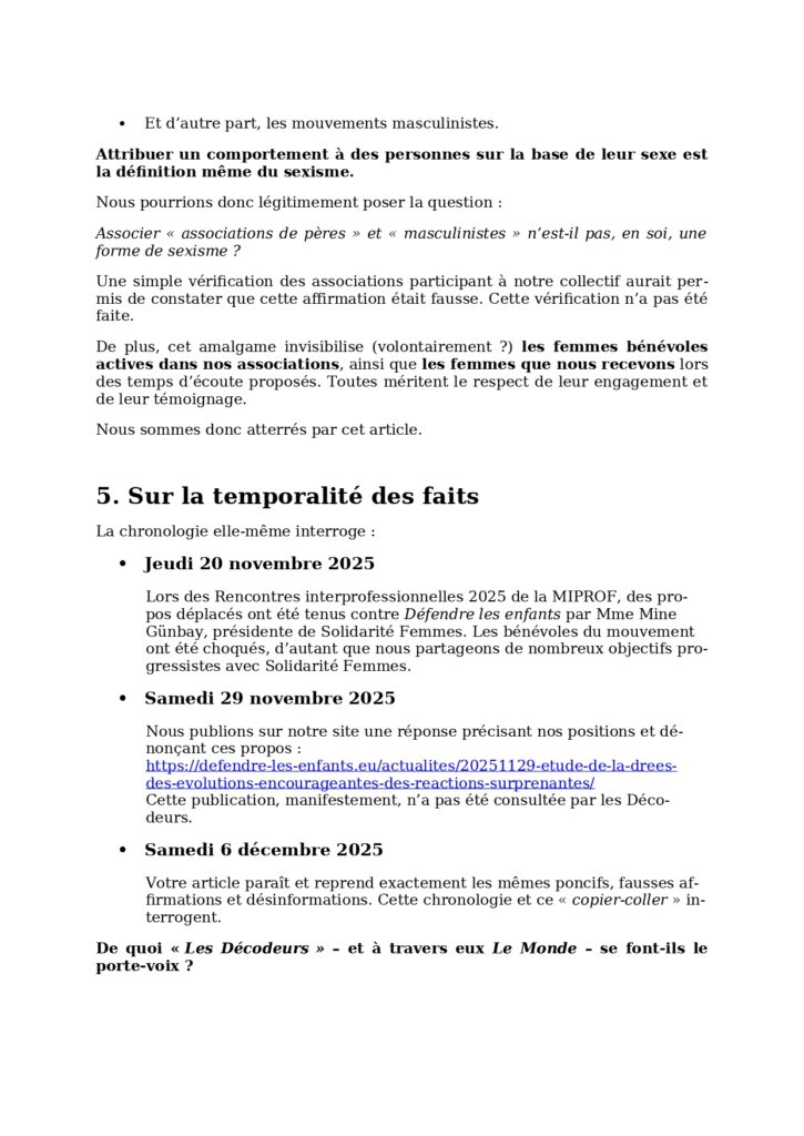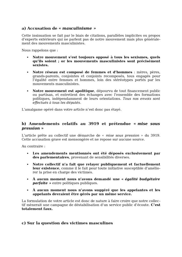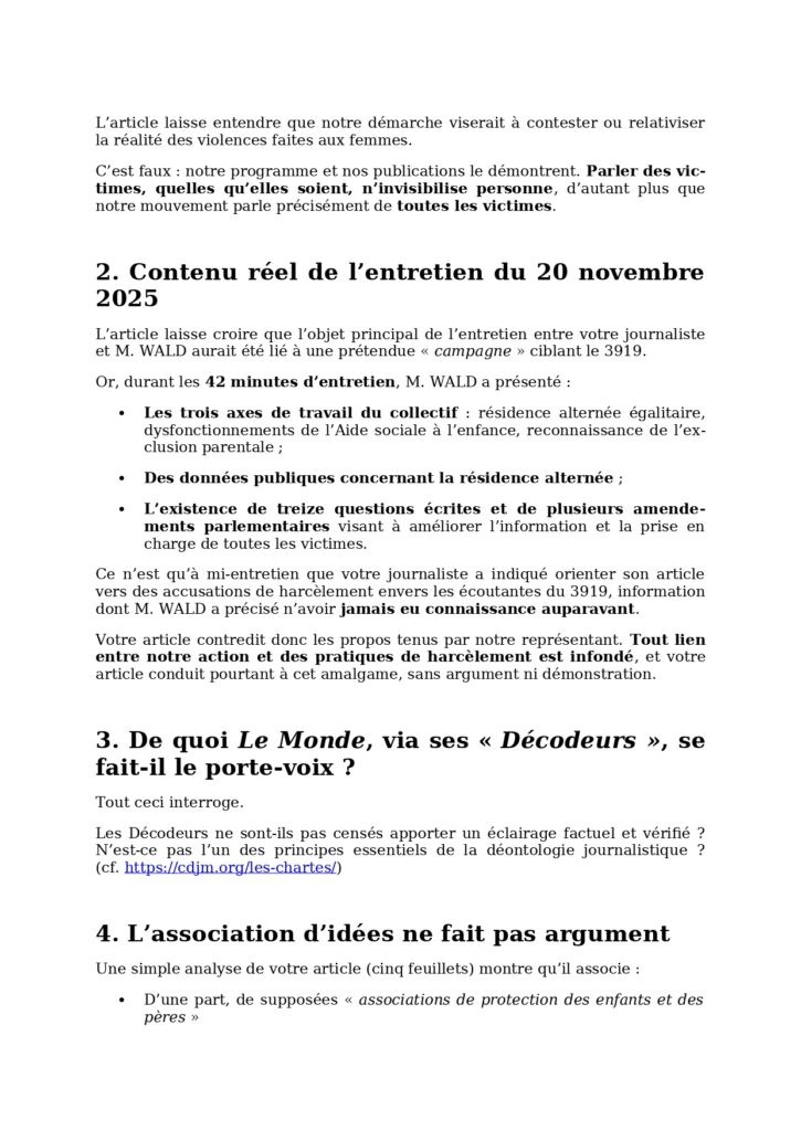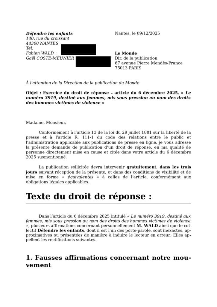 Dans un article publié de 6 décembre 2025 dernier intitulé « Le numéro 3919, destiné aux femmes, mis sous pression au nom des droits des hommes victimes de violence », Le Monde critique indirectement les douze associations composant « Défendre les enfants » – un collectif qui milite principalement pour la généralisation de la résidence alternée des enfants après séparation et la reconnaissance de l’exclusion parentale – en les qualifiant de « masculinistes ». Une offense facile, qui, combinée à celle d’ « extrême droite », permet de décrédibiliser qui que ce soit et d’éviter les sujets gênants.