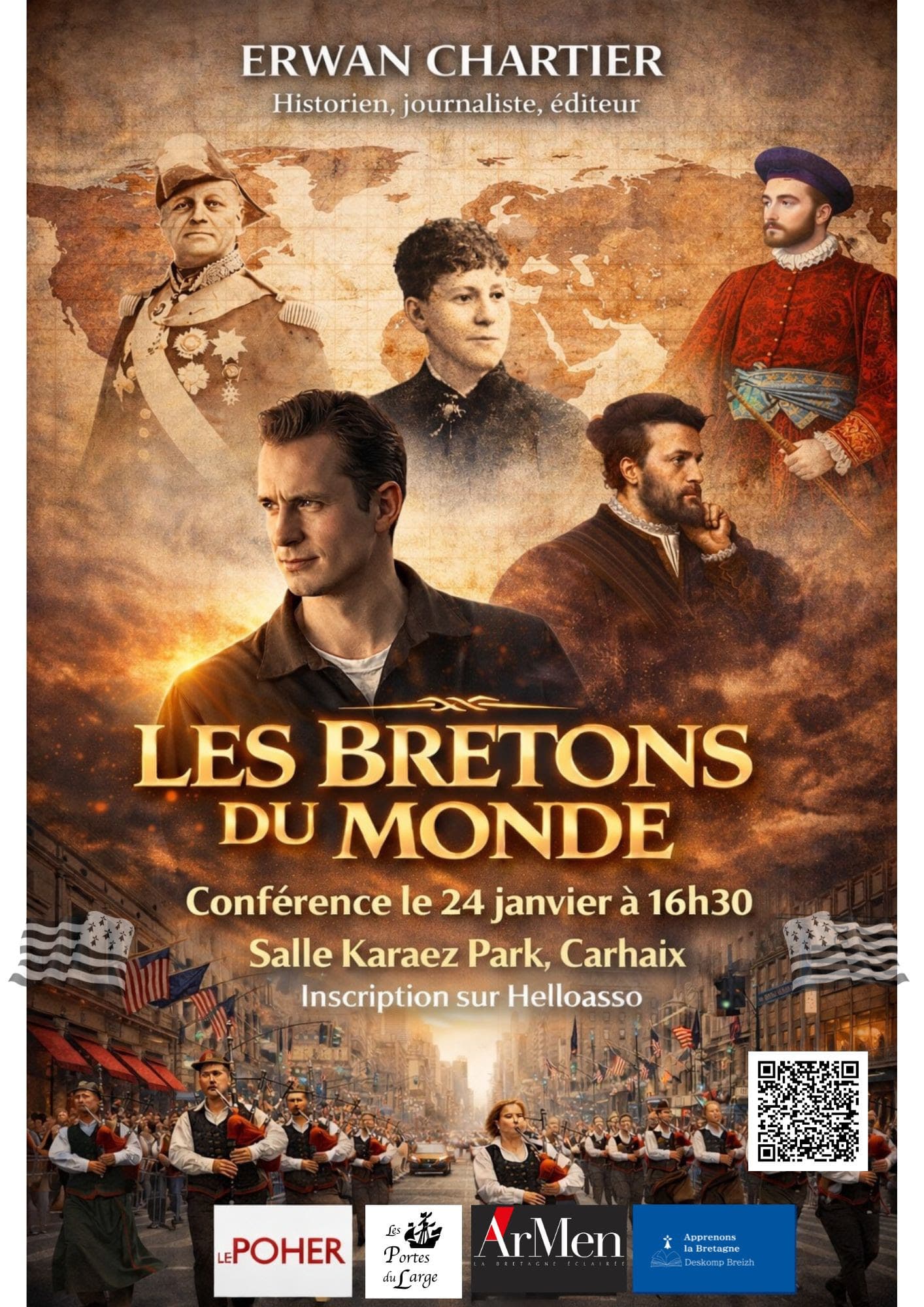 Samedi 24 janvier 2026, à 16h30, la salle Karaez Park de Carhaix-Plouguer accueillera une conférence d’Erwan Chartier, historien, journaliste et éditeur, consacrée à un thème qui parle à tous les Bretons : l’aventure, l’exil et l’esprit voyageur. Intitulée Les Bretons du monde, cette rencontre propose un vaste panorama des trajectoires bretonnes aux quatre coins de la planète, du Moyen Âge à nos jours.