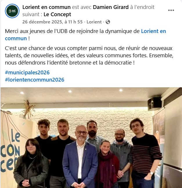 En attendant, les deux composantes lorientaises de l’UDB se déchirent pas réseaux sociaux interposés. Le premier coup de semonce est venu de la liste « Lorient en Commun » de Damien Girard qui postait une photo du candidat entouré de jeunes présentés comme « membres de l’UDB ».