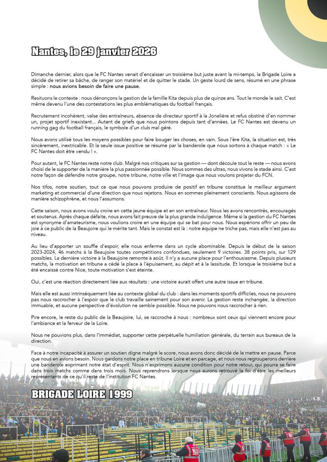 Devant la situation catastrophique du FC Nantes, reléguable en ligue 2 et enchaînant défaites sur défaites, la Brigade Loire, principal groupe de supporters vient de diffuser le communiqué suivant :