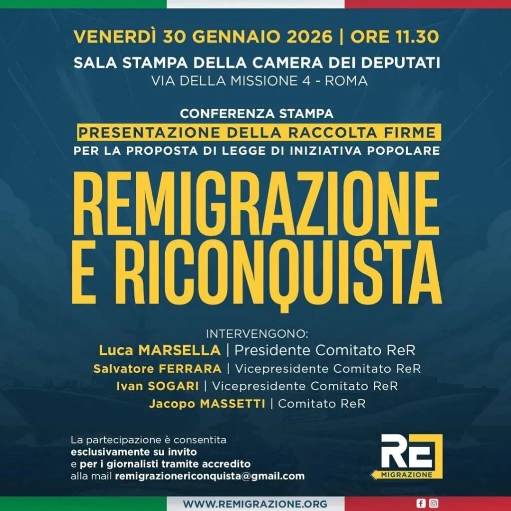 Rome. Le 30 janvier 2026, le comité « Remigrazione e riconquista » devait présenter son projet de loi d’initiative populaire à l’Assemblée. Mais l’événement a été annulé pour des raisons d’ordre public, après que les députés de l’opposition ont occupé la salle de presse pour leur faire barrage. Une méthode intimidante et discriminatoire qui rappelle plus la mafia que la démocratie…