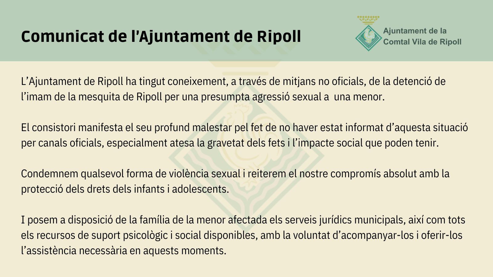 La victime de l’agression sexuelle présumée est une jeune fille de 13 ans, l’imam a été arrêté début février puis remis en liberté provisoire en attendant son jugement. A Ripoll, cette affaire suscite une émotion qui s’étend progressivement à toute la Catalogne. Après les attentats de 2017, la population avait demandé la fermeture de la mosquée, considérée comme un nid de djihadistes, ce qu’elle n’avait pas obtenu. La maire Silvia Oriols, élue en 2023 à la suite de cette affaire, réclame également auprès des autorités la fermeture du lieu.