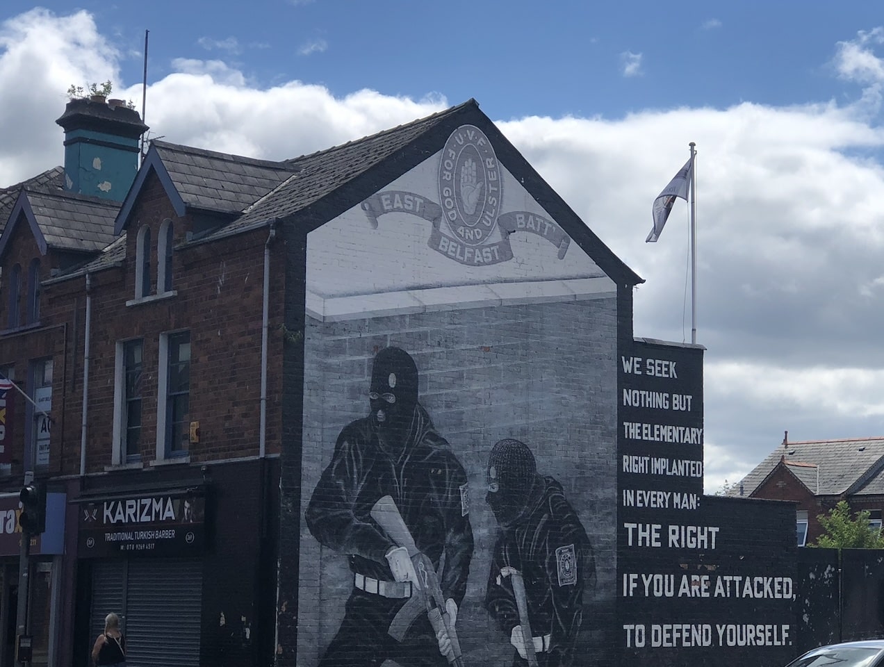 Peinte il y a plus de quinze ans sur un mur pignon très exposé, l’image montrait deux paramilitaires masqués accompagnés d’un insigne de l’UVF et d’un slogan invoquant le droit de se défendre. Elle incarnait le retour de fresques militarisées dans certains quartiers loyalistes, à la faveur des tensions liées notamment aux protestations sur les drapeaux au début des années 2010.