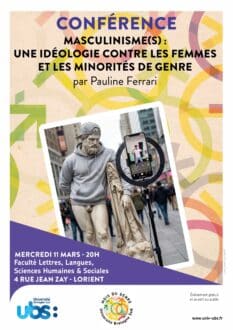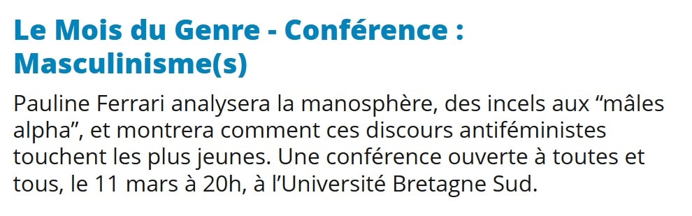 Hag anze e vo klevet o fegement get ar baotred arre. D’an 11 a viz meurzh e vo ur brezegenn get Pauline Ferrari. Hi a brezego àr ar « c’hourelouriezh » peotramant « masculisme » e galleg. Ha c’hoazh, bout zo mar a hini reve hi, dav eo lakaat un S ‘ba fin : Masculinisme(s).