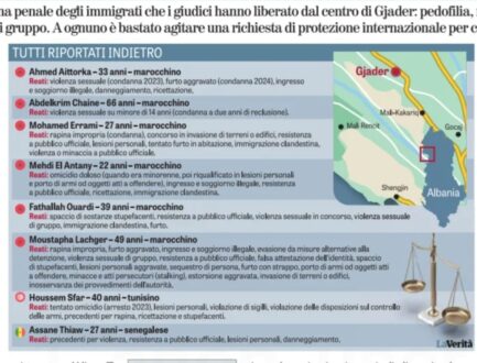 - Moustapha Lachger, marocain, 49 ans. Parmi les infractions figurent : violence sexuelle en réunion, trafic de stupéfiants, coups et blessures, enlèvement, vol, vol aggravé, entrée et séjour illégaux sur le territoire italien, évasion, résistance à un officier public, la fausse attestation d’identité personnelle, port d’armes ou d’objets susceptibles d’offenser, menaces et actes de harcèlement, extorsion aggravée, conduite en état d’ébriété et sous l’effet de stupéfiants. Transféré à Gjader. Il fait une demande de protection internationale : les juges ordonnent son retour en Italie.